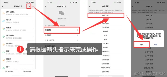 步骤3:在该页面中点击**【故障修复】,然后选择【聊天记录】选项,这时页面会弹出一个提示框,仔细阅读确认后请单击【确定】**按钮即可。
