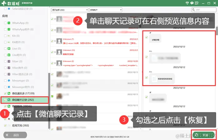 步骤3:上述操作完成后即可开始恢复聊天记录,在该页面将想要恢复的聊天记录勾选好,然后将其恢复到手机上即可。