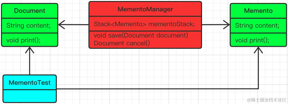 创建Document类作为我们日常编辑的文档,因为要保存文档快照,所以创建Memento类作为备忘录类,通过备忘录管理类MementoManager来实现备忘录的保存和读取,内部通过堆栈数据类型Stack保存备忘录列表。具体类图,如下所述: