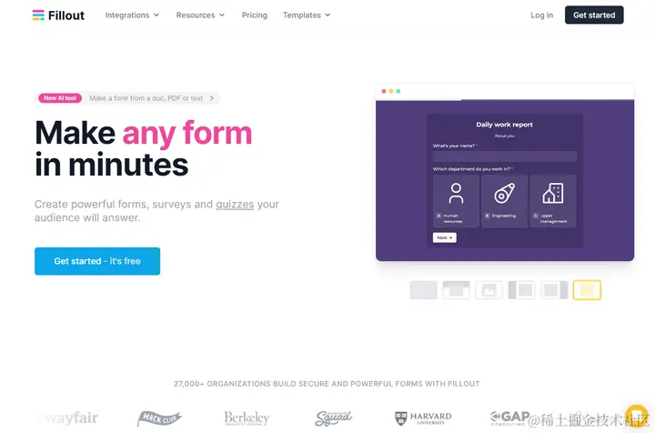 Fillout AI 是一款调查问卷工具,提供 40 多种高度可定制的问题类型和高级功能,可让您在几分钟内创建表单、调查和测验。您可以从文档、PDF 或文本制作表单。表单生成器专为 HubSpot 设计,可让您随时随地收集或更新数据。您可以连接数据库或在填写中存储答案、拖放问题以及在任何地方共享链接或嵌入表单。