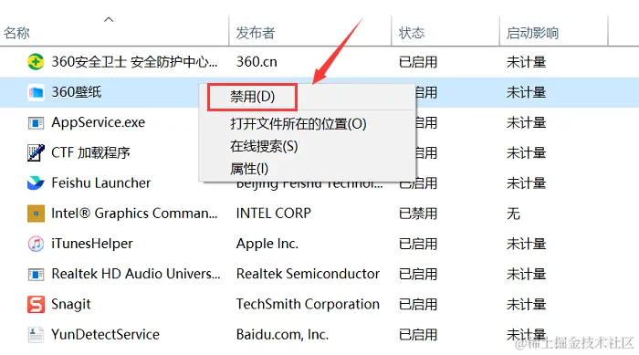 3.右键单击要禁用的启动项,然后选择 【禁用】,重启计算机,查看是否有改善。