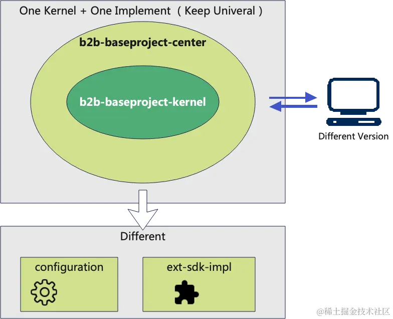 使用内核和具体实现应用分离的划分是因为前期因为有商业化衍生出了多版本开发。当然目前架构组是不建议一个内核多套实现的,而是建议一个内核加上一个主版本实现。避免因为多版本实现造成分裂,徒增开发和维护成本,改为采用配置和扩展点来满足差异化需求。