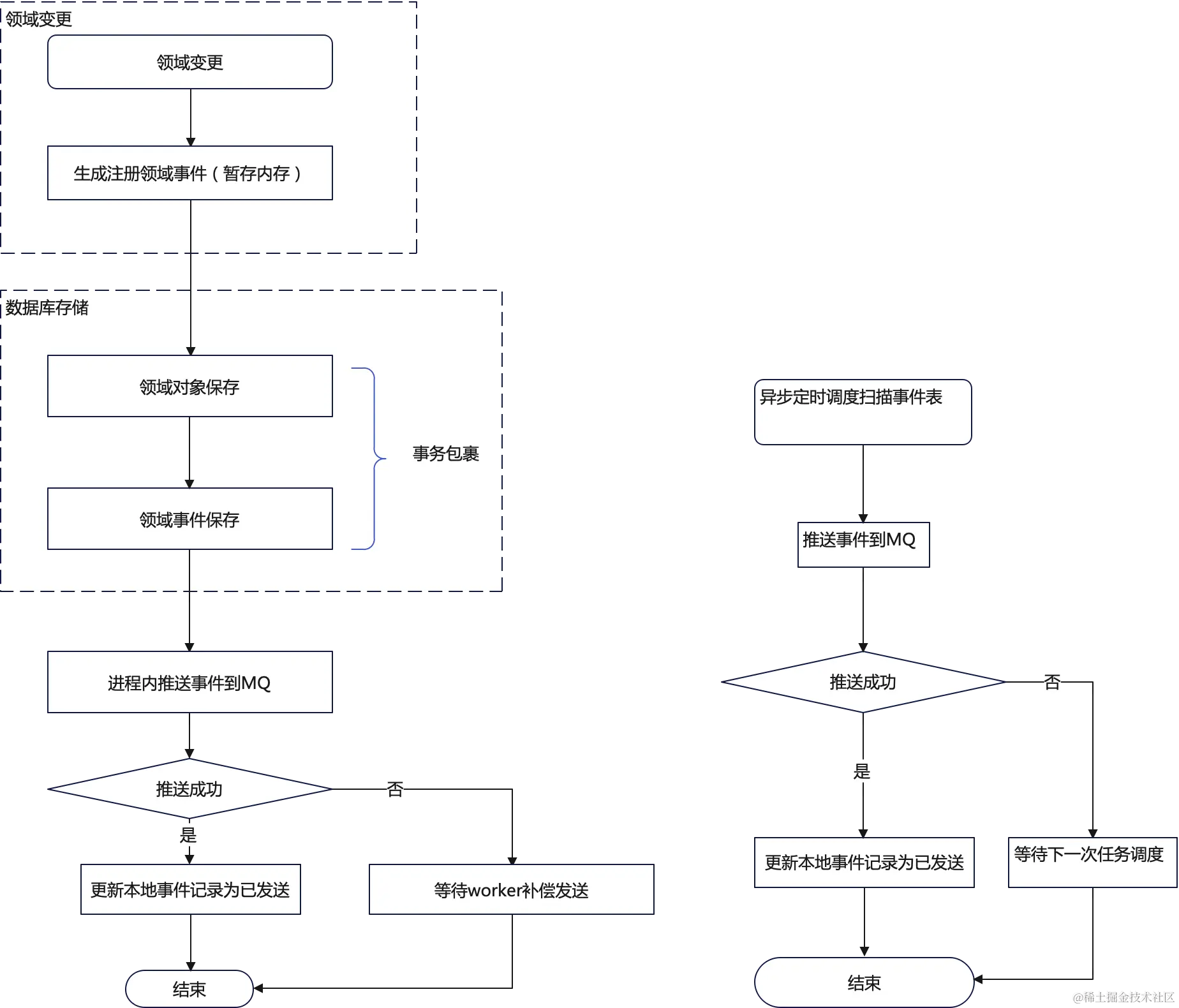 如果不依赖binlog和事务性消息组件, 为了保证领域事件一定被发送出去,就需要依赖本地事务表。我们将领域对象保存和领域事件发布任务记录在一个事务中得以执行。在领域事件推送消息中间件MQ中,在数据库保存完毕后,先主动发送一次(容许失败),如果发送失败再等待定时调度扫描事件表重新发送。如下图所示: