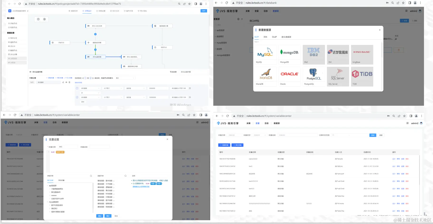 jvs-rules是基于JVS逻辑引擎构建的规则引擎,将JVS低代码开发平台的逻辑引擎简化,交互优化,从而形成侧重于金融风控、场景规则计算、在线决策的JVS-Rules。逻辑引擎侧重于逻辑处理(数据加工、规则判断、业务拼装) ,规则引擎侧重于规则判断,主要用于风控决策、规则过滤、行为评分等场景,本项目采用spring cloud+vue构建,支持在线的变量加工、界面拖拽、在线测试等多种功能。包含完整的前后端。