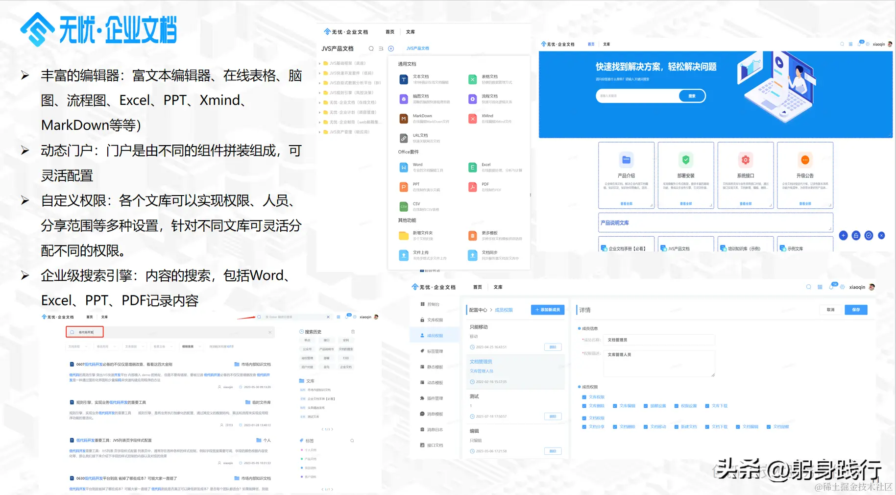 无忧企业文档是一款集知识库、网盘、又可以协同办公的在线工具。主要解决企业内部文档编辑、知识沉淀、知识协同、文件统一管控、数据资产化、知识流动、信息的检索 、信息的安全等问题。文档有丰富的编辑器,支持多人在线同时编辑。它支持word、Excel、ppt,还有在线收集表单、思维导图、流程图等,可以上传本地文件,随时随地的在云端预览、编辑、分享、点赞、收藏 。