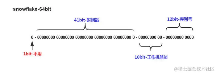 需要注意的是此处的 41 位时间戳并非存储当前时间的时间戳,而是存储时间戳的差值(当前时间戳 - 起始时间戳),这里的起始时间戳一般是ID生成器开始使用的时间戳,由程序来指定,所以41位毫秒时间戳最多可以使用 (1 << 41) / (1000x60x60x24x365) = 69年。