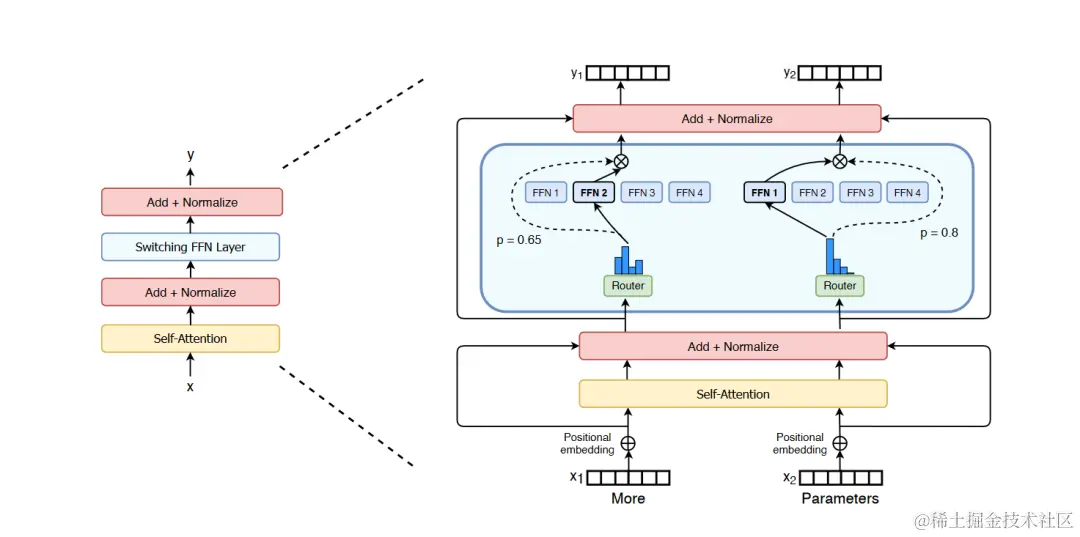 2021年1月,Google大脑团队发布文章“Switch Transformer:scaling to trillion parameter models with simple and efficient sparsity”,其简化了MoE的routing算法,并且gating network 每次只 route 到 1 个 expert。