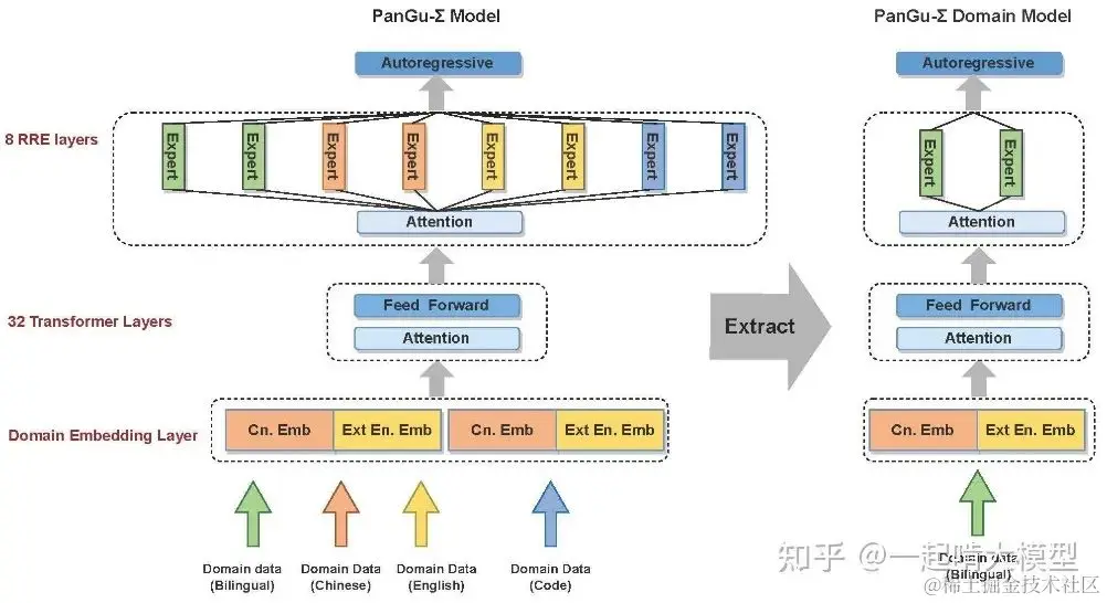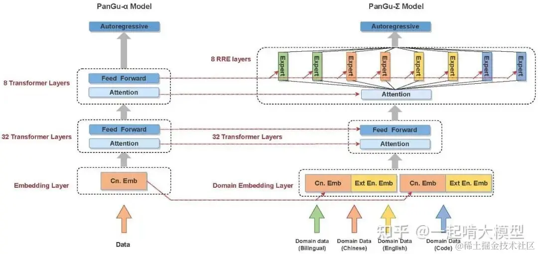 Pangu-sigma[8]是今年3月华为诺亚方舟实验室基于Pangu-alpha模型进行MoE扩充实现的Lifelong-MoE模型。其提出了随机路由专家(RRE)方法,使得Gating Network也可以随着Expert进行裁剪。下图是PanGu-Sigma的示意图: