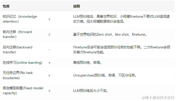 以上可以看出LLM实际上已经满足了大部分持续学习的性质,百亿千亿级别的大模型经过充足的预训练后,具备大量世界知识以及涌现能力,基于此进行终身学习成为可能。
