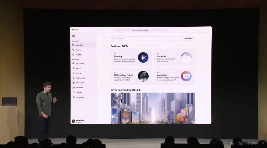 ChatGPT 正在从服务衍生成一个生态,阿尔特曼表示,OpenAI 本月晚些时候将推出 GPT 商店,你可以在 GPT Store 里分享你的 GPT,并根据使用人数来赚钱。
