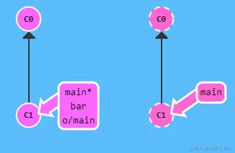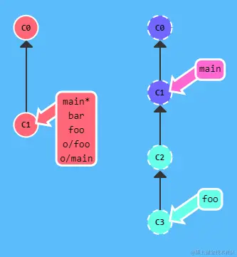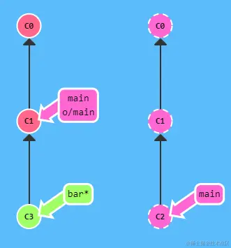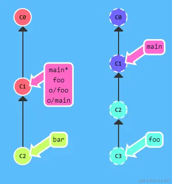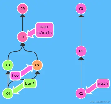 pull 也可以用 source:destination ,Git先在本地创建了一个叫 foo 的分支,从远程仓库中的 main 分支中下载提交记录,并合并到 foo,然后再 merge 到我们的当前所在的分支 bar 上