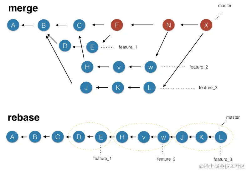 Git rebase进行分支合并时,你的提交树会变得很干净, 所有的提交都在一条线上。 - 整洁:合并提交的数量较少,相对整洁。