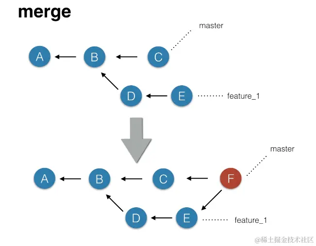 - 直观:操作会生成一个新的合并提交,其中包含了所有分支的更改,这一点在 Git 历史记录上也很明显。