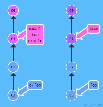 Git 会到远程仓库的 foo 分支上,然后获取所有本地不存在的提交,放到本地的 o/foo 上。