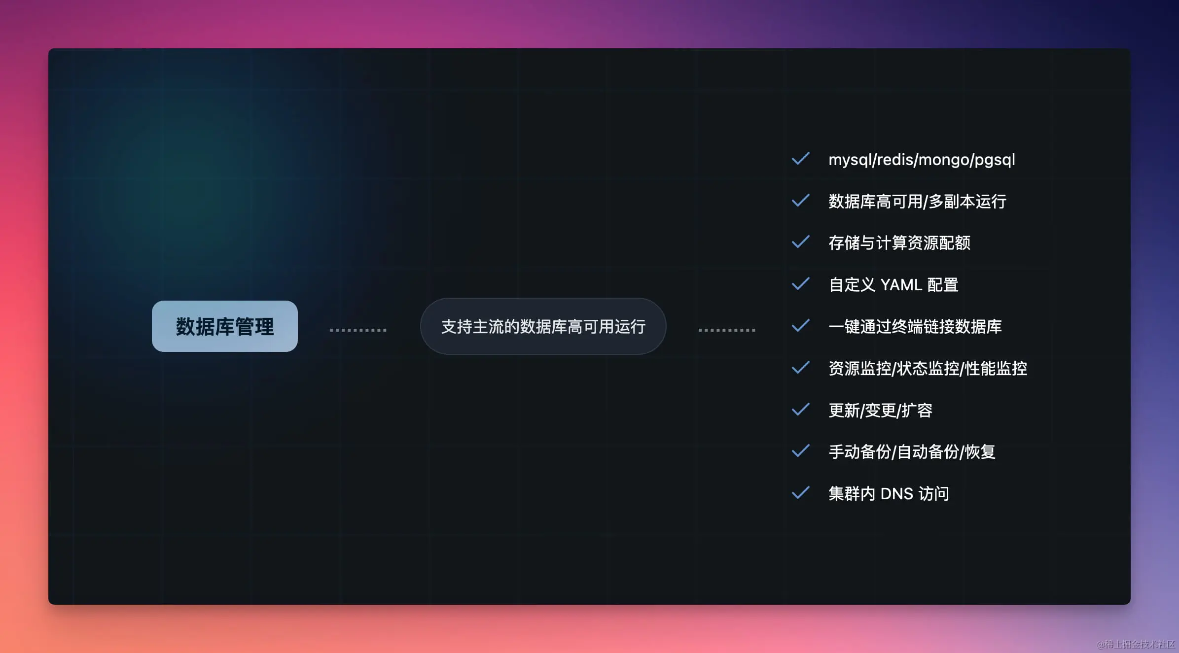 Sealos 也为数据库类应用提供了强大的支持。它已经内置了对多副本运行的支持,可以极大地提高数据库的稳定性,并且降低运维成本。