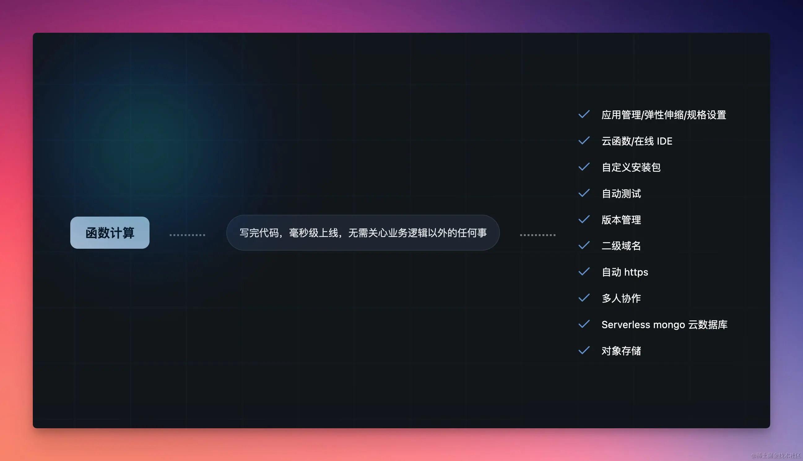 云计算的终极目标是 Serverless,也就是函数计算。通过函数计算(Function as a Service, FaaS),Serverless 不仅可以自动管理基础设施,还可以实现自动伸缩,让开发者将注意力完全集中在代码的编写和优化上。