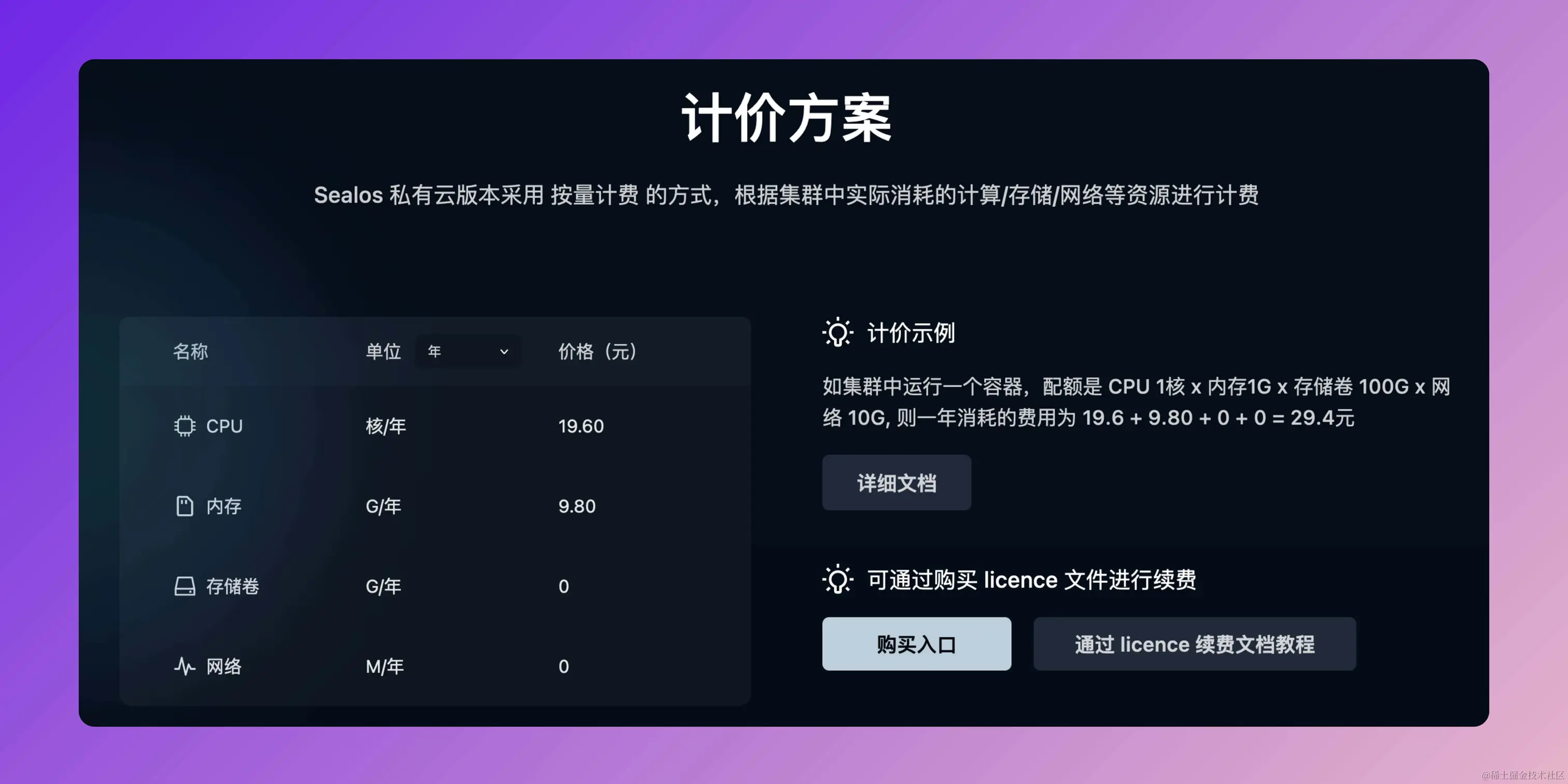 - Sealos 授权费用: 元(这里是按照集群用满的情况来计算的,实际授权费用会根据实际分配和使用的计算资源来进行计费)。