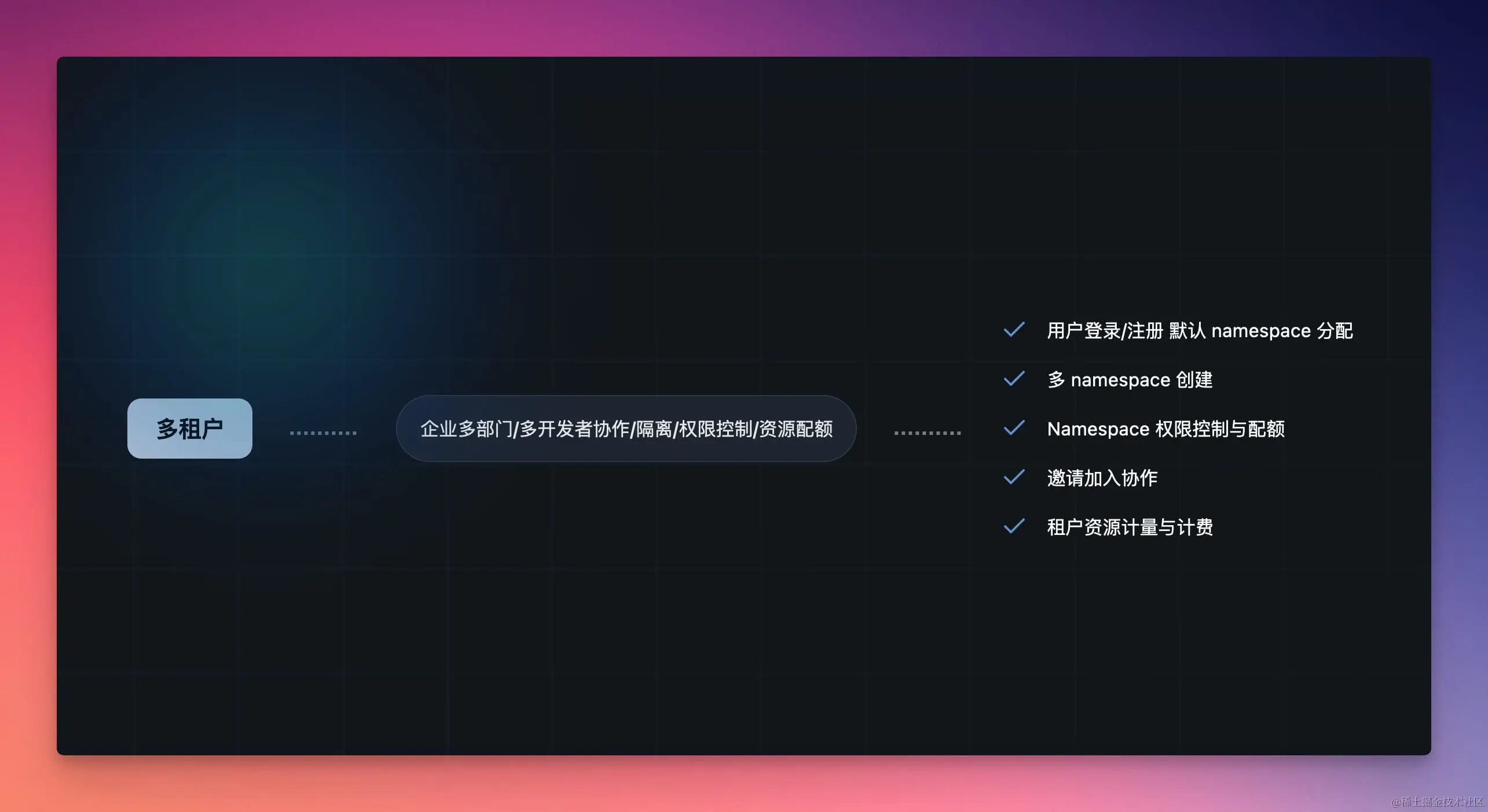 对于企业用户,Sealos 提供了完善的多租户支持。可以进行资源的计量和控制,同时还有完善的隔离和权限控制机制,支持多部门和多开发者协作。