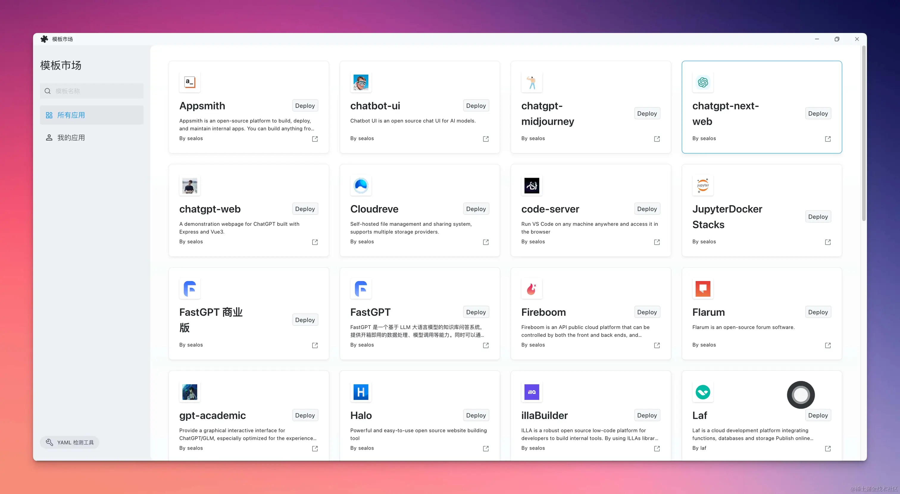 很多常见的分布式应用都可以通过 Sealos 应用市场一键安装,同时也可以在终端中手动安装应用市场中不存在的应用,完全兼容 Kubernetes。