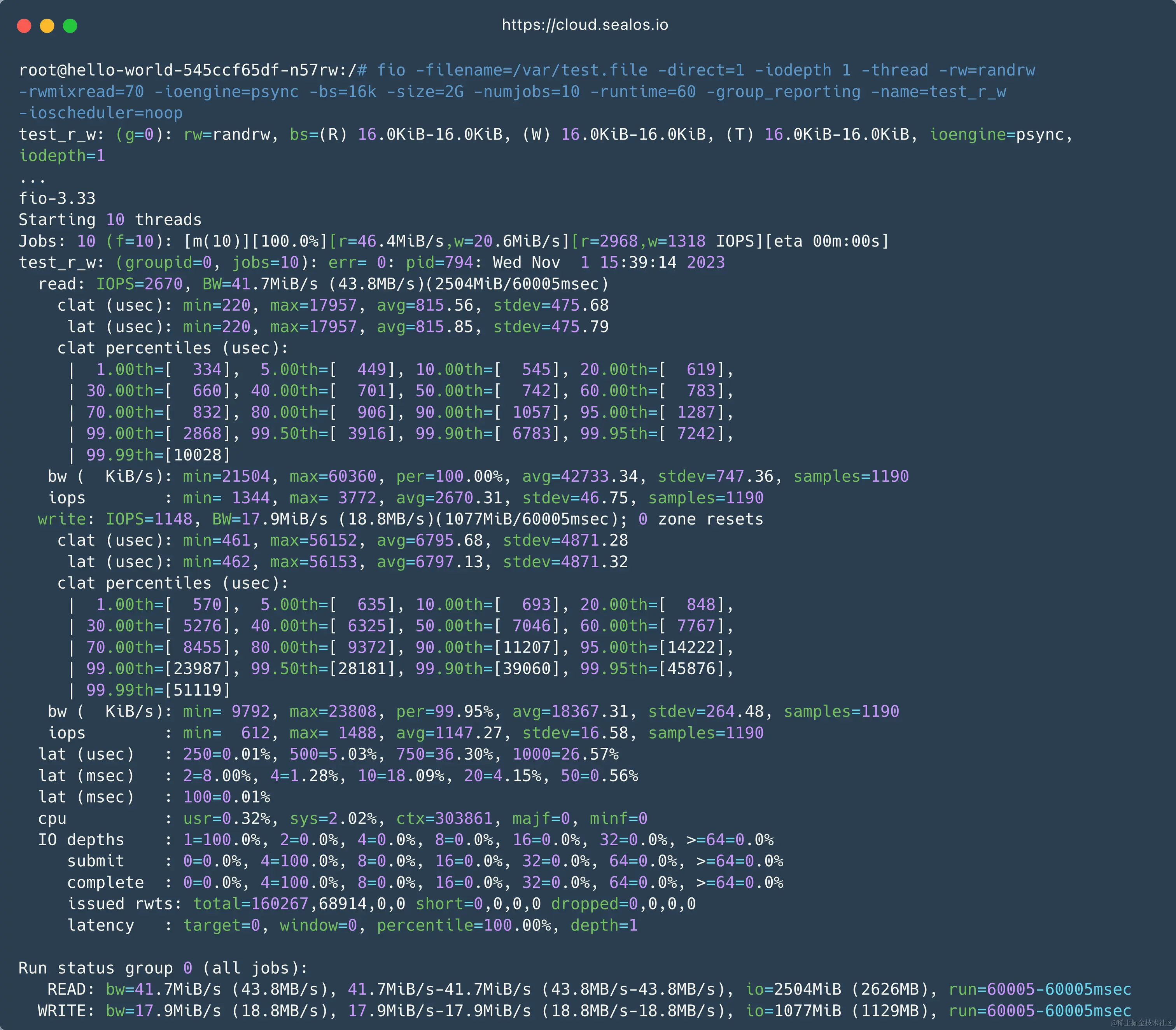 | Sealos on GCP(cloud.sealos.io) | 2626;42M/s | 1129;18M/s | 0.19ms ~ 0.99ms |