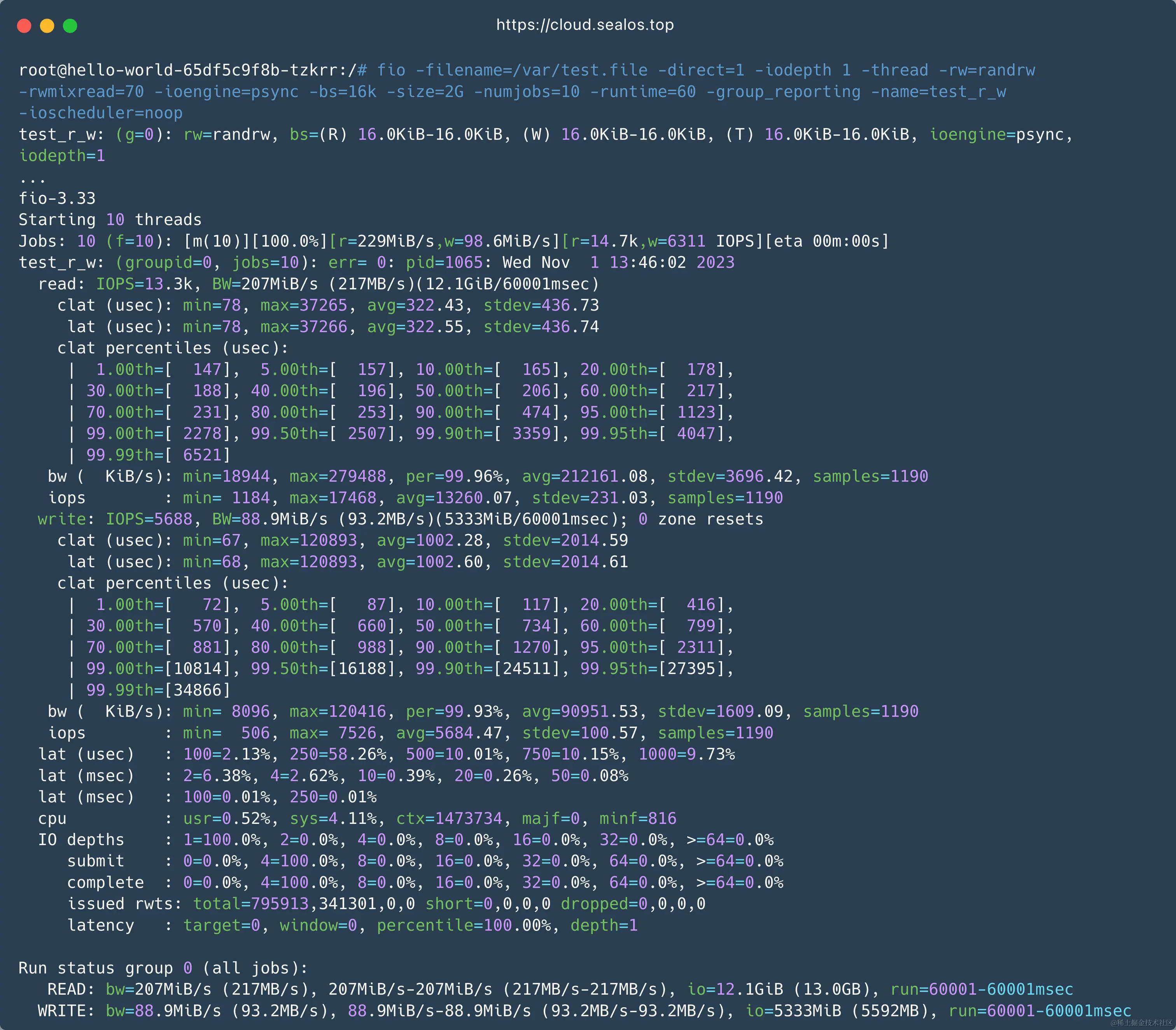 | Sealos on 托管硬件(cloud.sealos.top) | 13.0k;207M/s | 5792;89M/s | 0.14ms ~ 0.19ms |