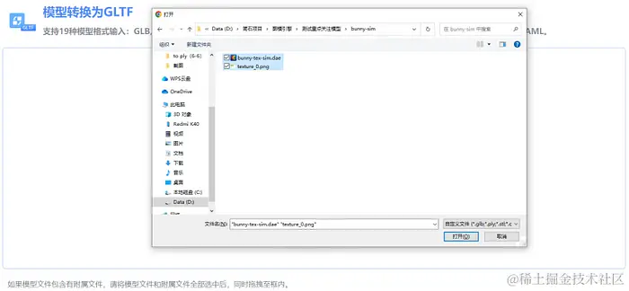 如果模型文件包含有附属文件(如材质贴图),则需要将文件同时上传。上传方式:点击【上传文件】,在文件选择框中,按住键盘上的【Shift】键,通过鼠标左键同时选择多份文件,进行文件上传。