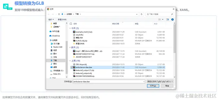 如果模型文件包含有附属文件(如材质贴图),则需要将文件同时上传。上传方式:点击【上传文件】,在文件选择框中,按住键盘上的【Shift】键,通过鼠标左键同时选择多份文件,进行文件上传。