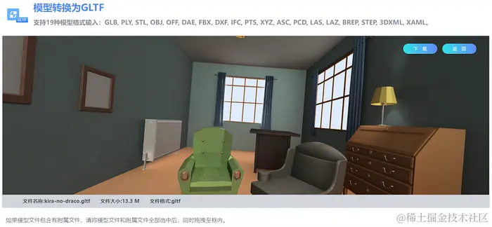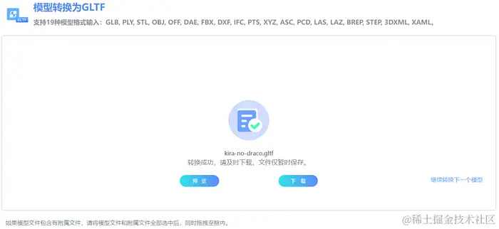 在OBJ转GLTF网站完成模型格式转换完成后,此时可以在线预览模型转换结果,可以直接下载转换结果,也可以继续转换下一个模型。