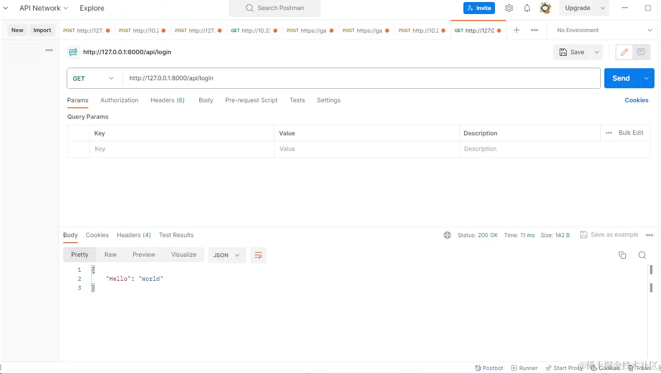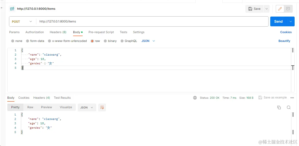 用 postman 发起请求,选 JSON 格式,因为接收的是 dict,所以 FastAPI 会自动将 JSON 字符串转换为 dict
