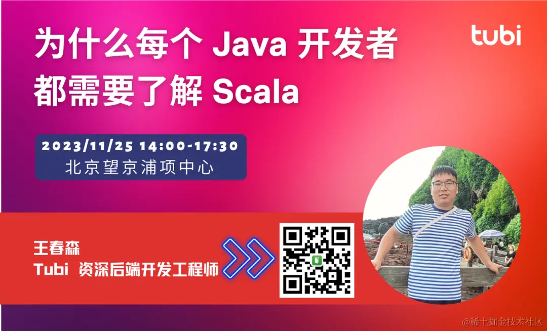 如果你对 Scala 与 Java 两门渊源紧密的编程语言都有兴趣并想进一步学习,或者非常关心 Java/JDK 对 Scala 开发带来的影响,欢迎参与 2023 年 11 月 25 日在 Tubi 北京办公室举办的 Scala & Java Meetup 线下活动!