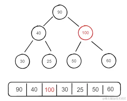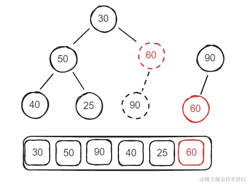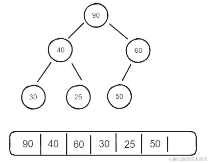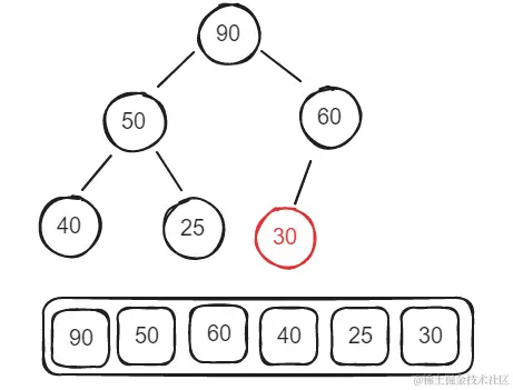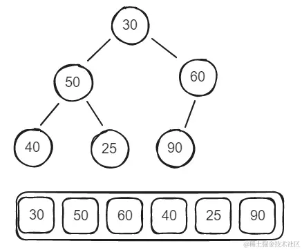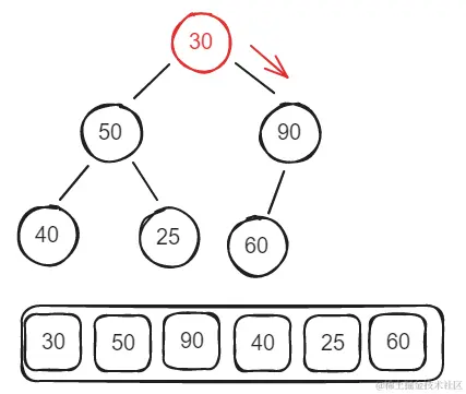 - 假设一个堆的数组结构是[30, 50, 60, 40, 25, 90];此时展示未一个堆的话就是