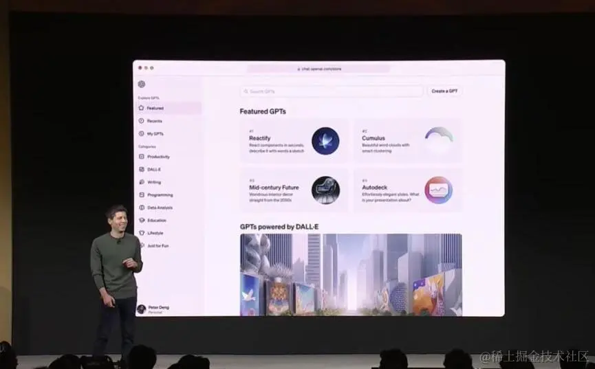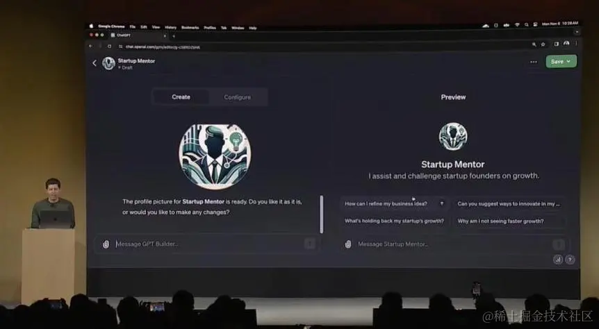 本场活动的第二个重要产品——GPTs登场,意味着用户将能通过自定义指令来构建自己的GPT,GPTs可以执行多种任务,如网络搜索、图像制作和数据分析等, 用户无需编程知识和技能即可创建自己专属的ChatGPT,并能对外发布给全球更多的人使用。更重要的是,整个构建“自定义GPT”的过程也是通过自然语言对话形成的。