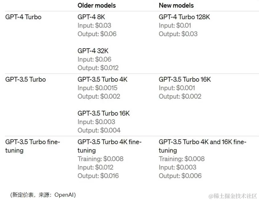 而在市场极为关注的定价方面,GPT-4 Turbo的价格要远低于GPT-4。其中输入Token的价格只有三分之一,而输出Token的价格只有一半。 也就是说,输入1000个Token的定价为1美分,而输出1000个Token的定价为3美分。与此同时,GPT-3 Turbo 16K模型的价格也有所下调。