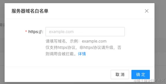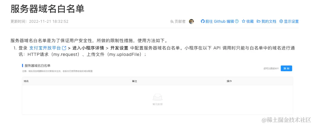 如上图,登录后,在开发设置找到服务器域名白名单。添加一次的操作是,点击添加 -> 输入域名 -> 点击确定。然后几十个域名需要重复上述操作。