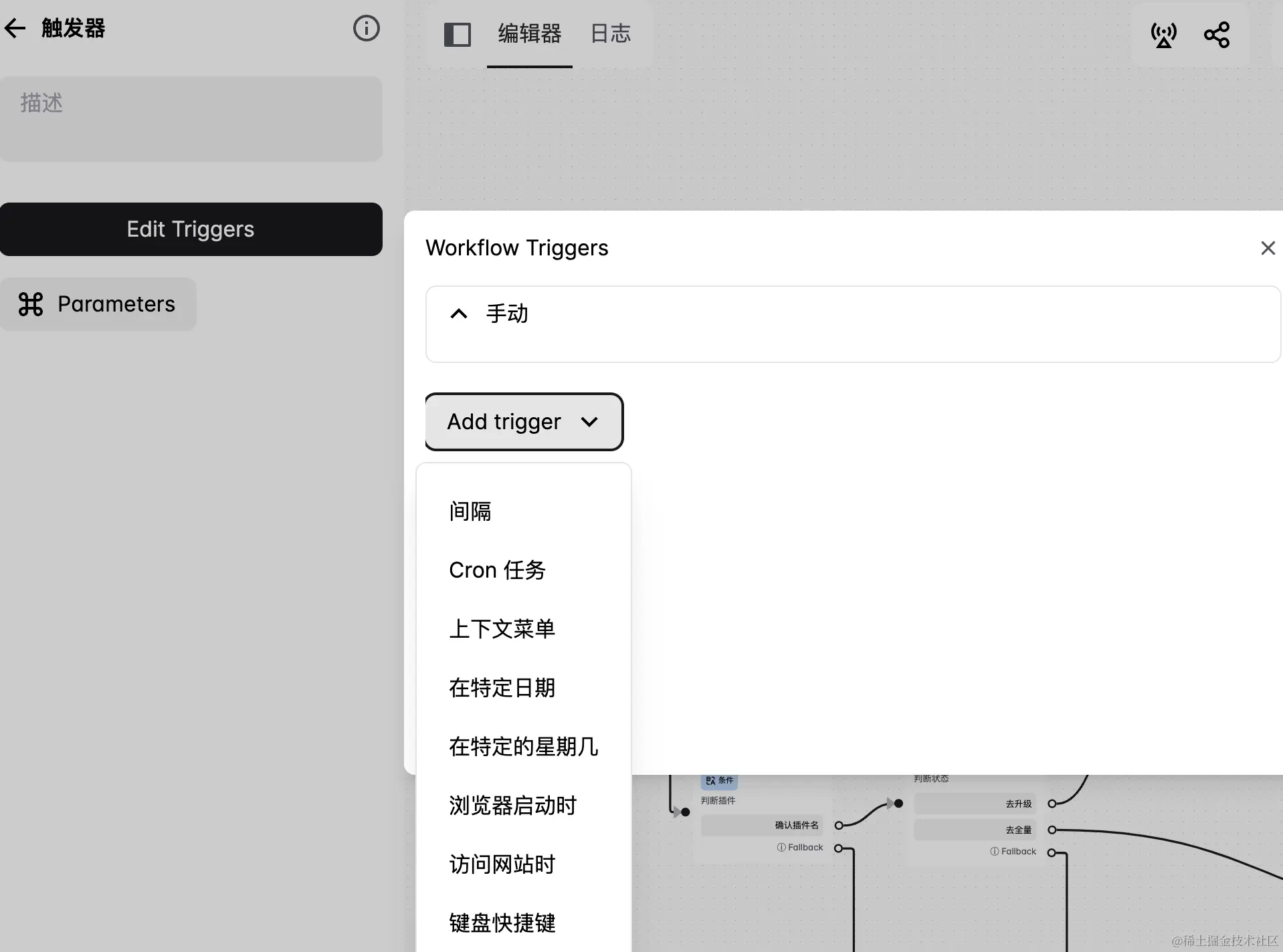 一个脚本以触发器开始,新建脚本默认会有一个触发器。编辑触发器,有编辑触发器和参数两个配置。其中编辑触发器,默认手动,可以换成下图的多种触发方式,可以按时间定时执行,也可以设置快捷键等。