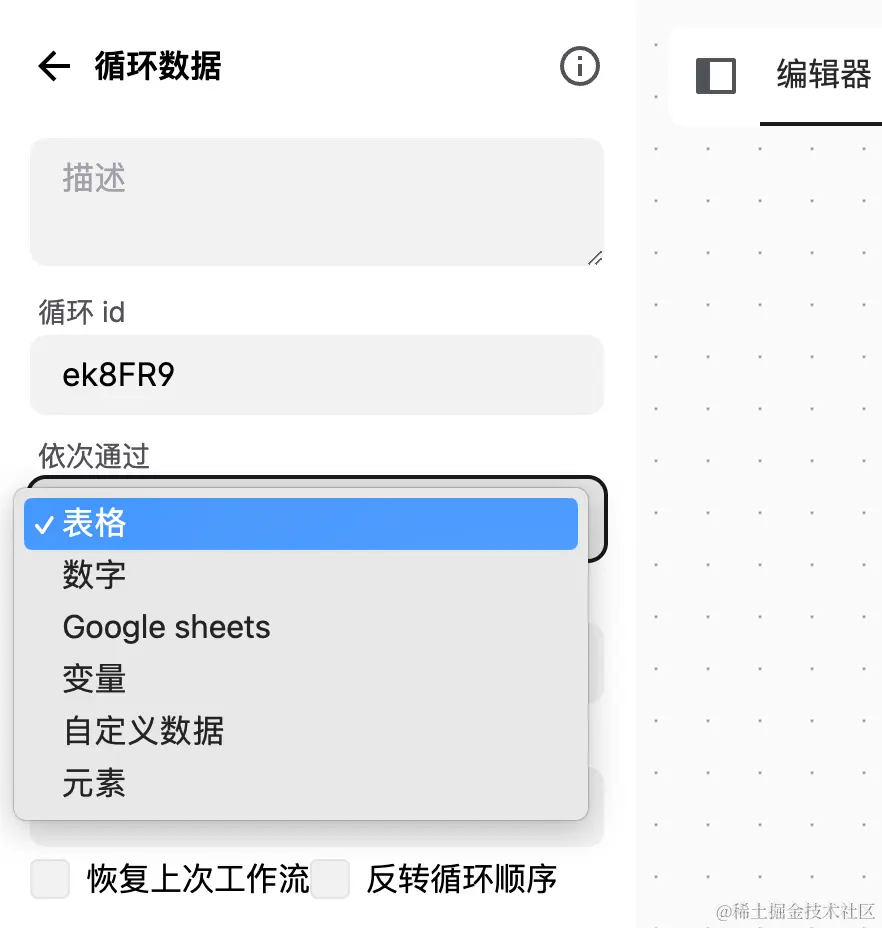 循环有循环数据和循环元素两个方式。在表单配置项,还有代码中,可以通过loopData拿到当前循环数据或元素。loopId是循环组件配置的loopId,循环结束也要放一个循环结束组件,也要填相同的loopId。