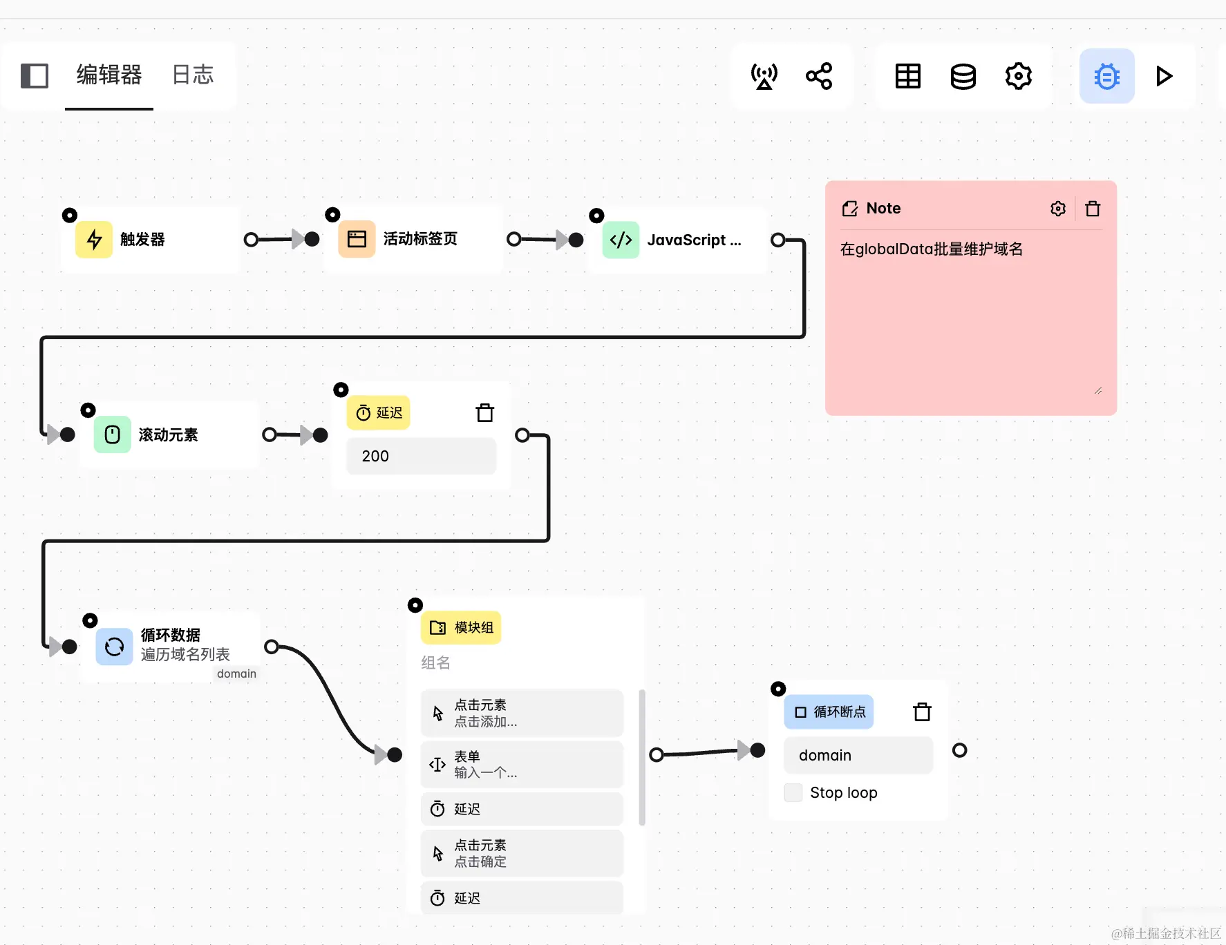 每次循环我们要执行的操作放在中间。依次是点击元素(添加按钮)、表单(输入域名!!{{loopData.domain.data}})、延迟、点击元素(确定按钮)、延迟。