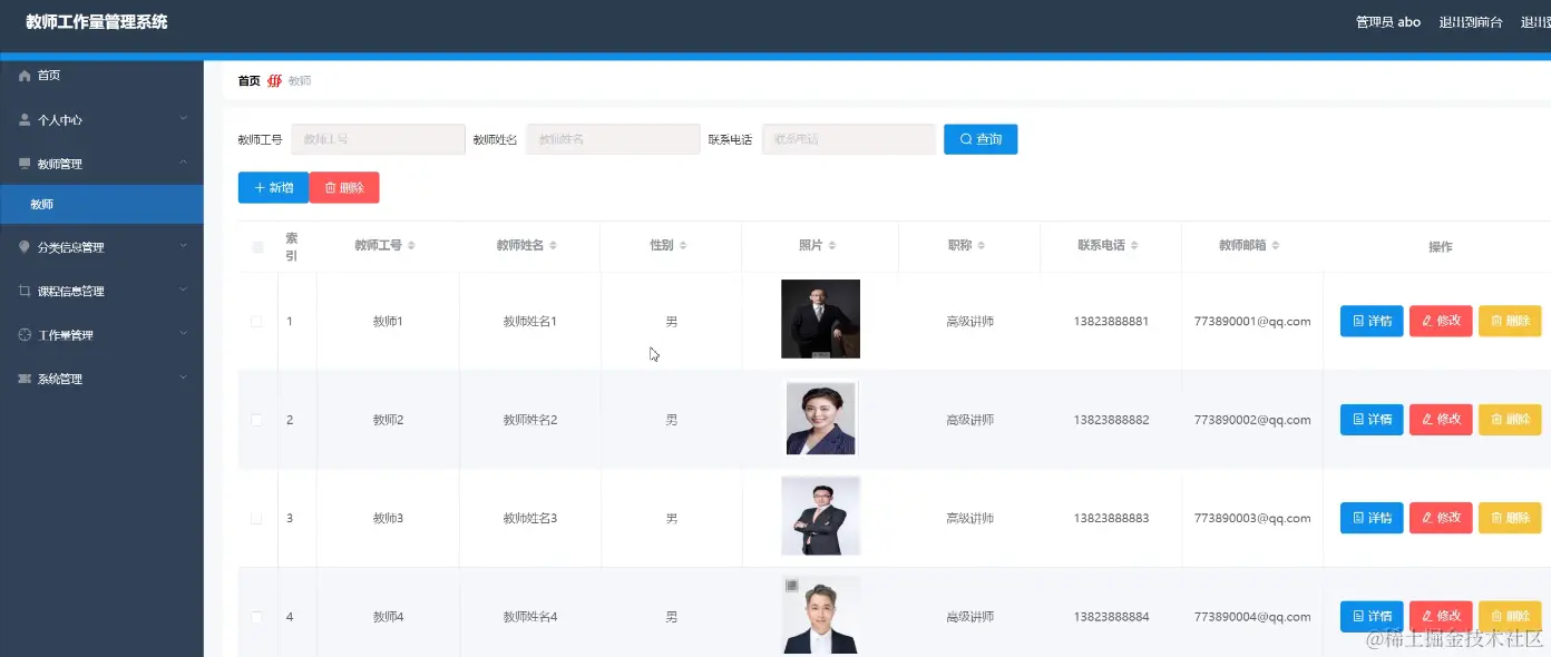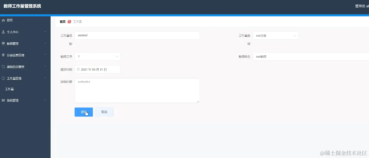 本教师工作量管理系统管理员功能有个人中心,教师管理,分类信息管理,课程信息管理,工作量管理,系统管理等。教师功能有个人中心,课程信息管理,工作量管理。因而具有一定的实用性。