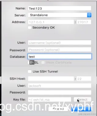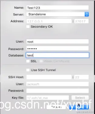 现在我们登陆test,按照上面设置的用户名是root,密码是123456,指定数据库是test