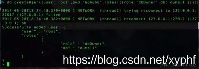 db.createUser({user:'root',pwd:'666666',roles:[{role:'dbOwner',db:'dumall'}]})