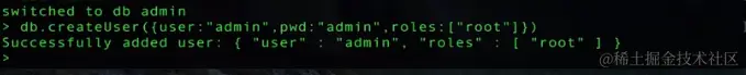 是通过db.createUser({user:"admin",pwd:"admin",roles:["root"]})