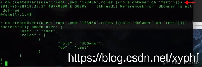 db.createUser({user:'root',pwd:'123456',roles:[{role:'dbOwner',db:'test'}]})