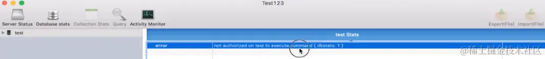 以授权的方式启动,就不能随意的访问别人的数据库了,如我们再访问test,提示test没有进行授权认证