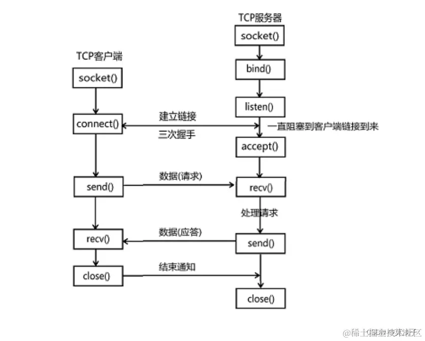 使用socket的API函数编写服务端和客户端程序的步骤图示: