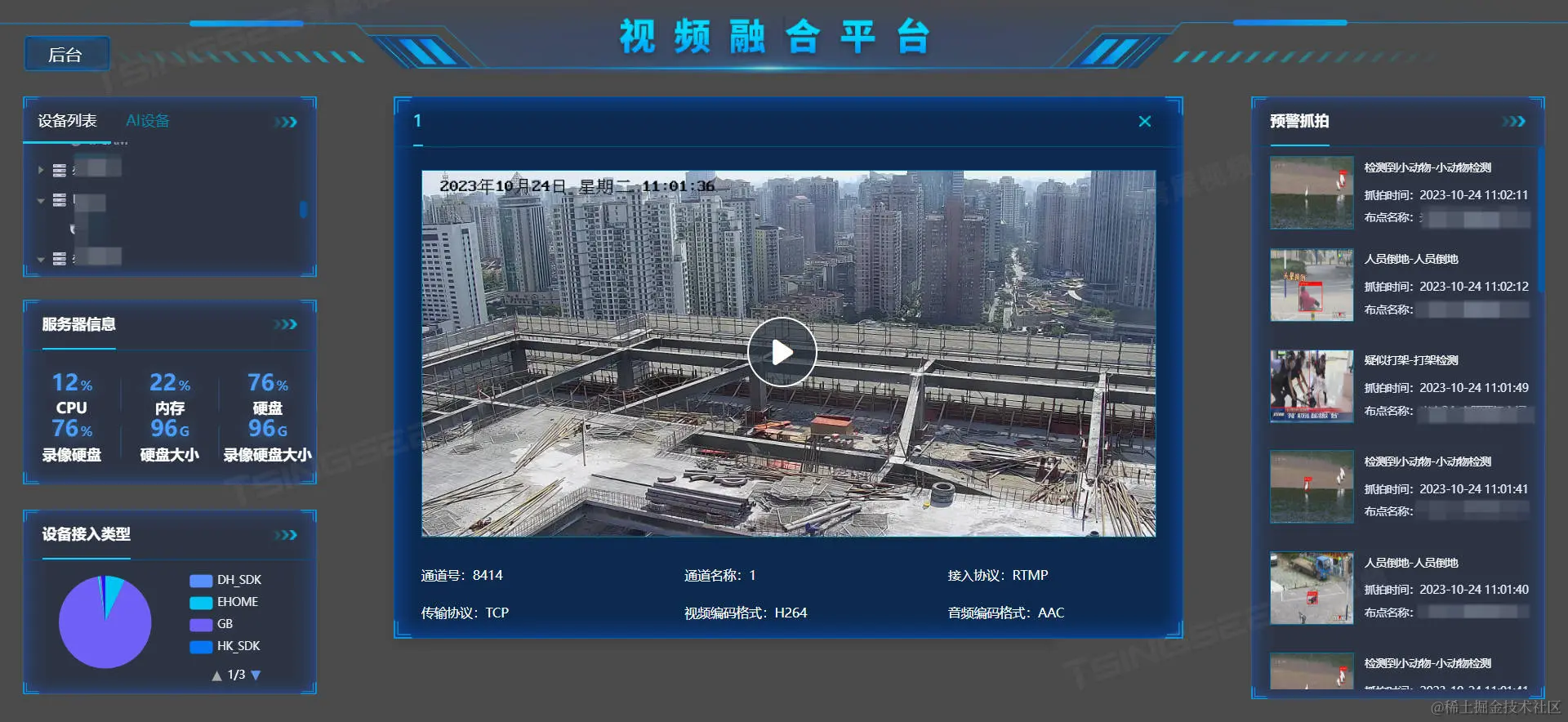 安防视频监控/视频集中存储/云存储/磁盘阵列EasyCVR平台可拓展性强、视频能力灵活、部署轻快,可支持的主流标准协议有国标GB28181、RTSP/Onvif、RTMP等,以及支持厂家私有协议与SDK接入,包括海康Ehome、海大宇等设备的SDK等。平台可拓展性强、视频能力灵活,能对外分发RTMP、RTSP、HTTP-FLV、WebSocket-FLV、HLS、WebRTC等视频流。