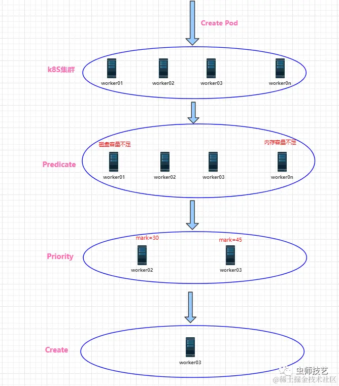 3.1. 过滤:首先是kube-scheduler调度器用一组规则过滤掉不满足条件的主机,这个过程称为predicate,比如明确指定所需要的资源类型,这样就可以过滤掉不满足条件的主机。