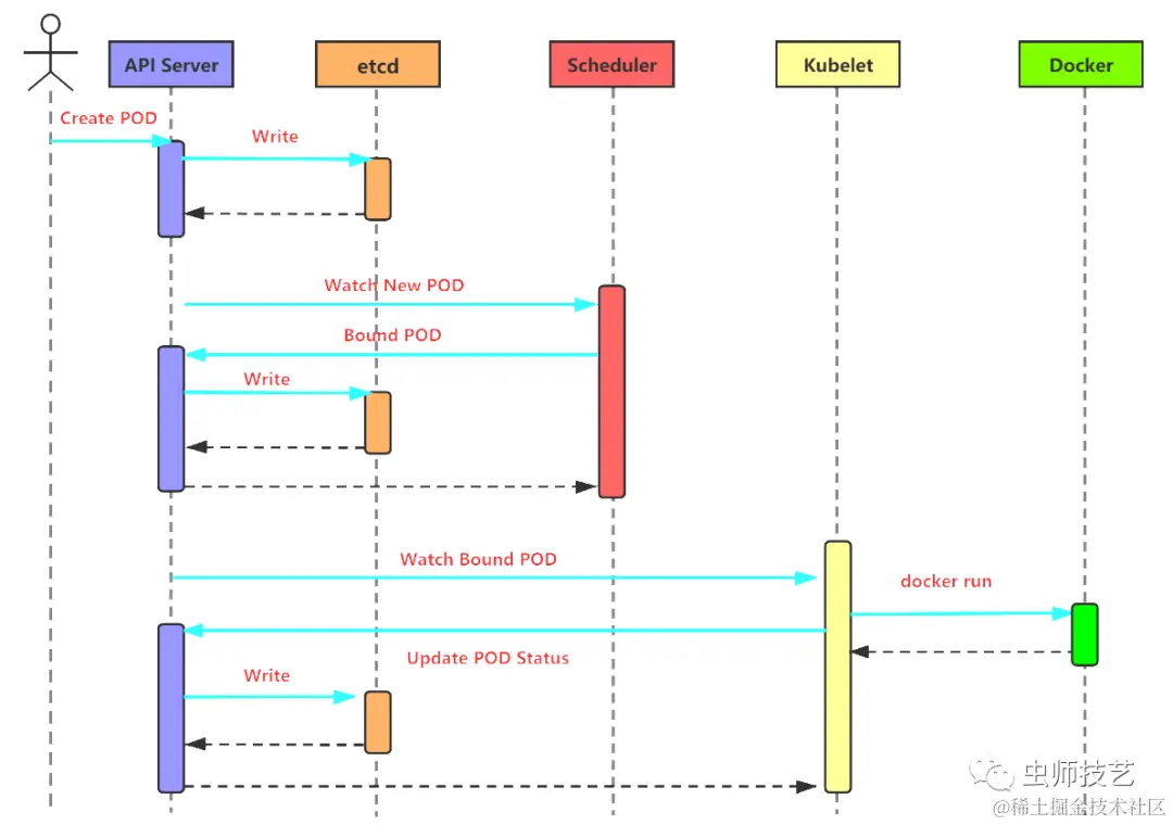 运行在每个工作节点上的kubelet也会定期与api-server同步bound Pod的信息,一旦发现在该工作节点上运行的bound Pod对象没有更新,则调用Docker API创建并启动pod内的容器.
