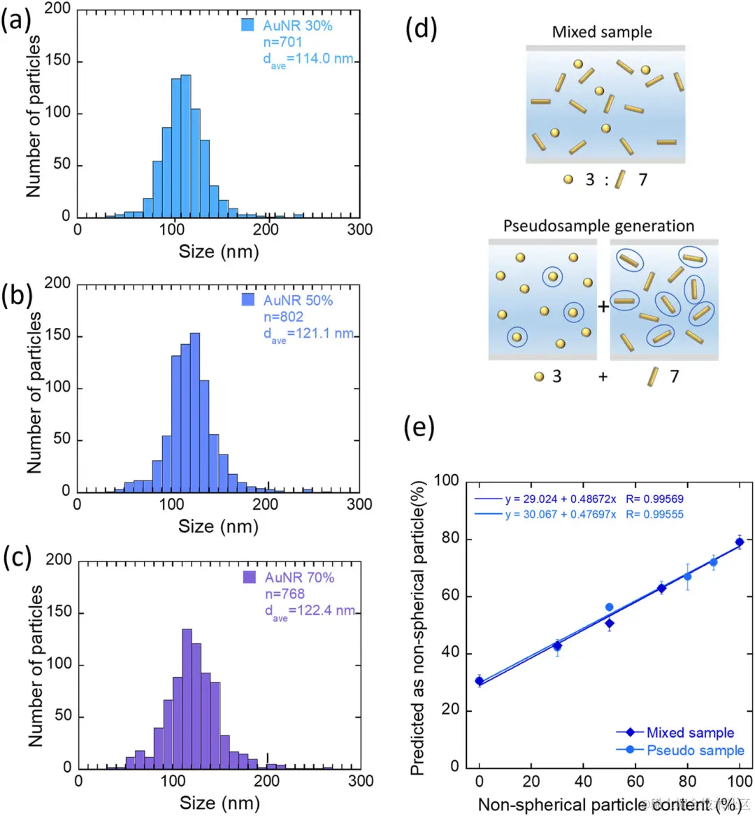 此外,研究证明了球形纳米粒子和棒状纳米粒子的混合比例可以从纳米粒子混合样品的测量数据定量估计。这一结果表明,通过将 DL 分析应用于 NTA 测量来评估粒子形状是可能的,这在以前被认为是不可能的。