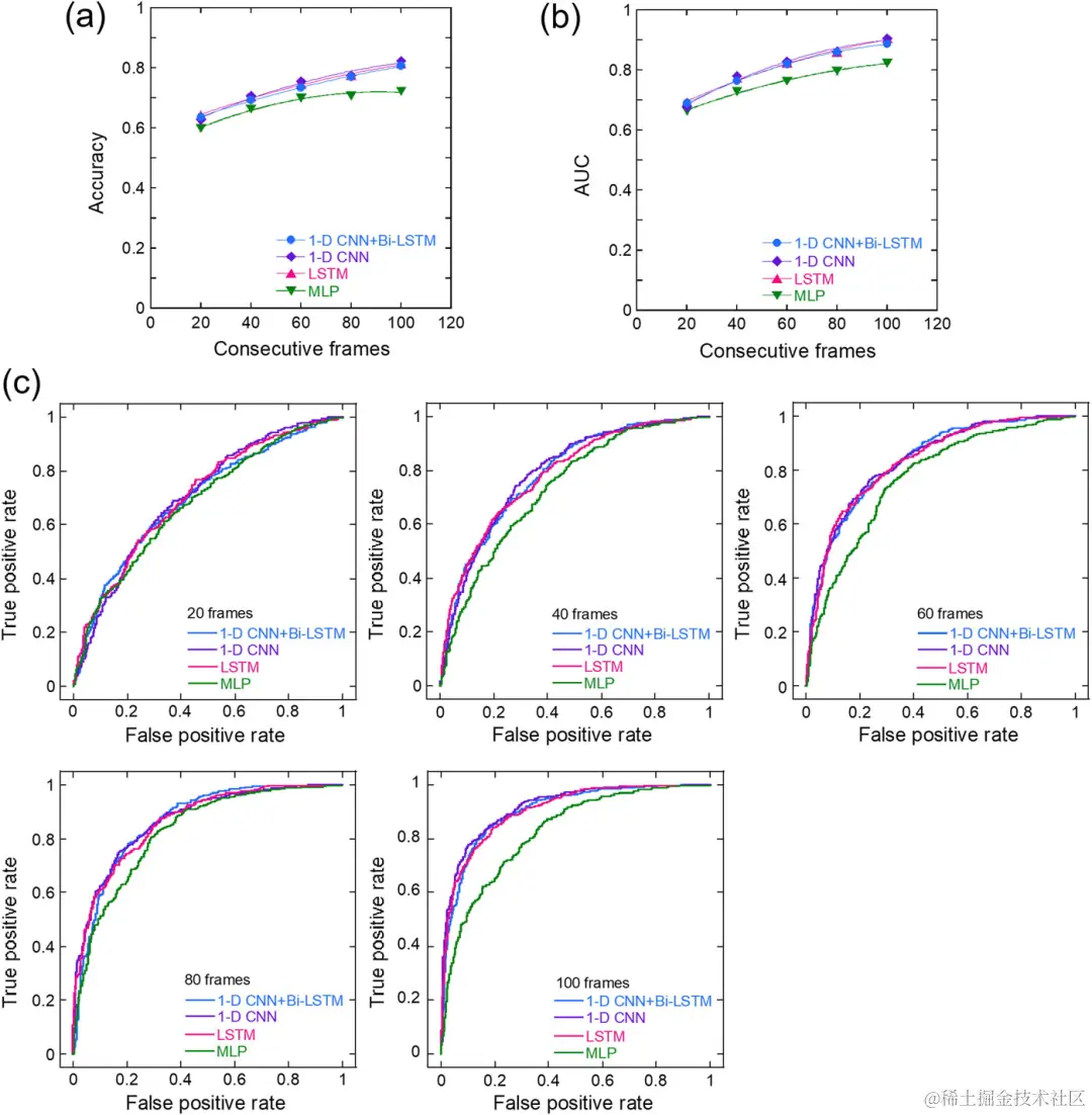 研究使用不同轨迹长度(20、40、60、80 和 100 帧的时间序列数据,通过改变四种模型(MLP、LSTM、1D CNN 和 1D CNN+Bi-LSTM)的每帧数的超参数来验证学习的收敛性。