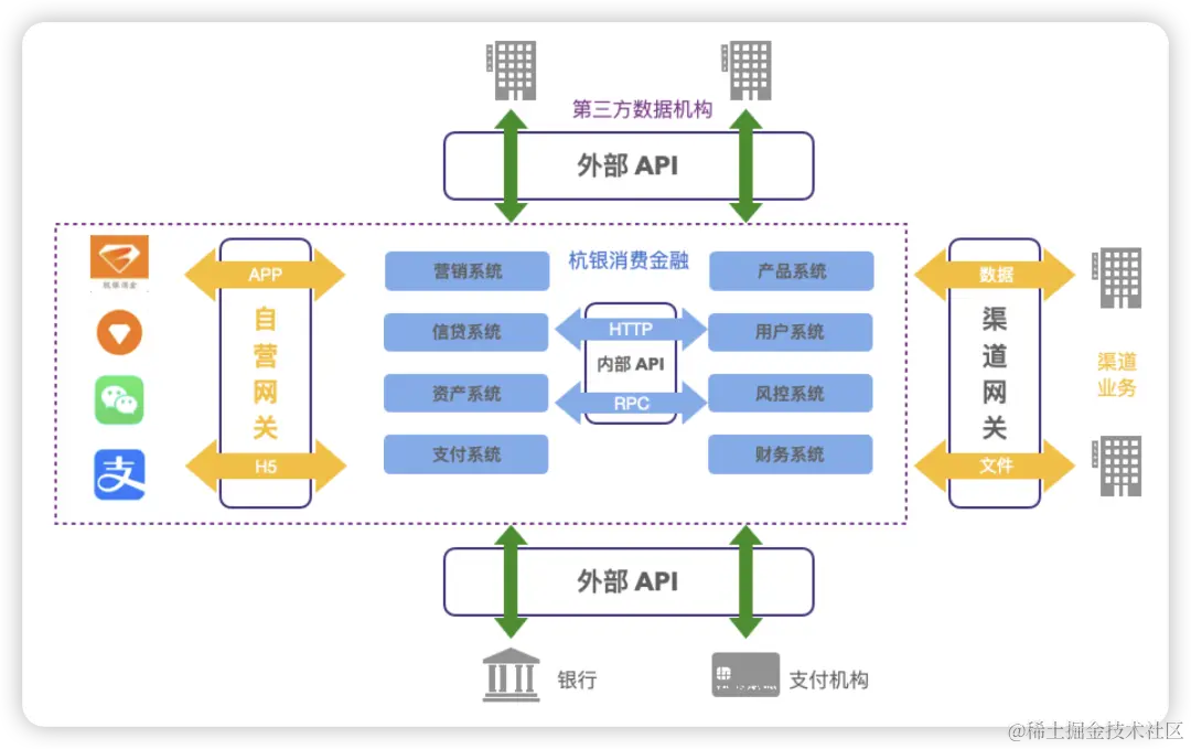 杭银消费金融经历了长期的高速发展,随着科技自研能力的不断提升和系统架构的不断升级,目前拥有上百个内部系统,这些系统之间存在复杂的调用关系,形成了庞大而错综复杂的业务链路(如图1所示)。同时,公司的金融系统与多个引流渠道和三方机构进行外部对接,进一步增加了系统的复杂性。